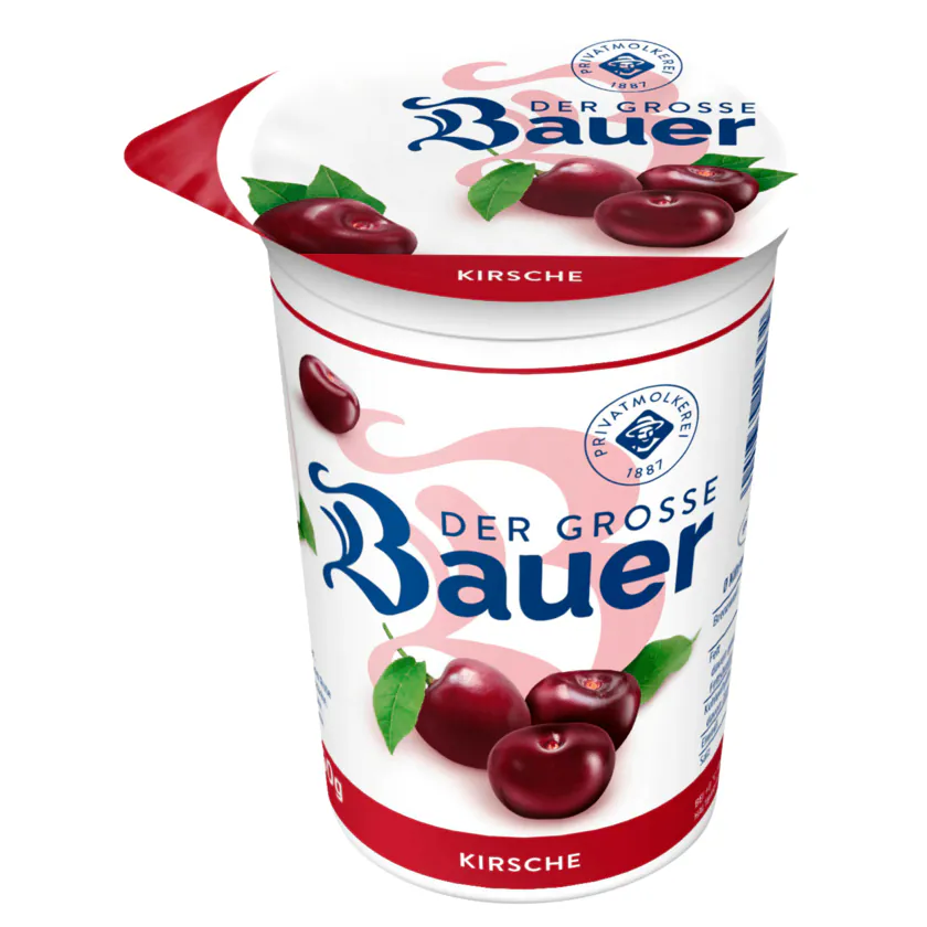 Fruchtig-frisch, mit bayerischer Milch, ohne Gelatine und Konservierungsstoffe - der große Bauer Kirsch ist ein echter Klassiker. Qualität und Tradition, die man einfach schmeckt.