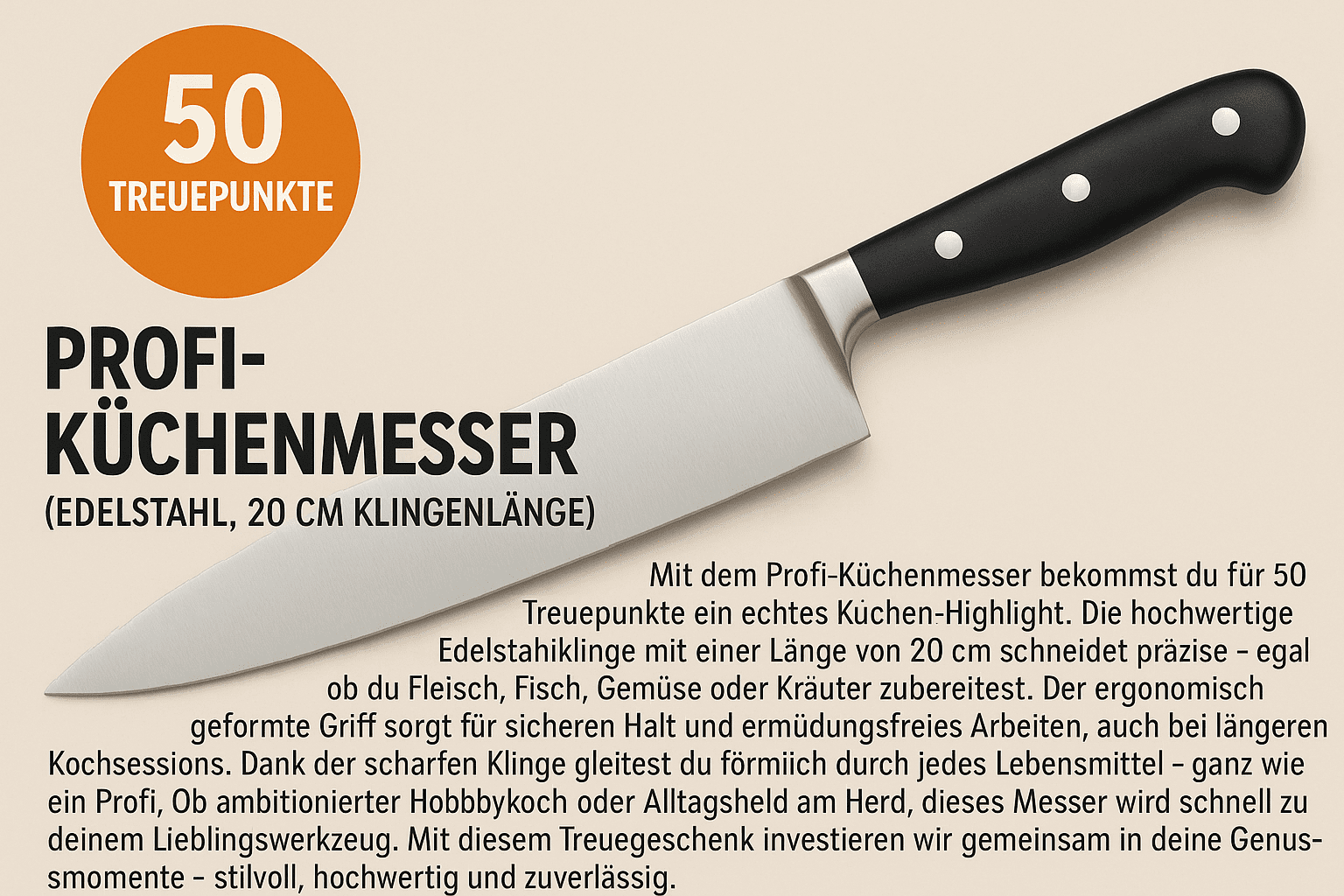 Mit dem Profi-Küchenmesser bekommst du für 50 Treuepunkte ein echtes Küchen-Highlight. Die hochwertige Edelstahlklinge mit einer Länge von 20 cm schneidet präzise – egal ob du Fleisch, Fisch, Gemüse oder Kräuter zubereitest. Der ergonomisch geformte Griff sorgt für sicheren Halt und ermüdungsfreies Arbeiten, auch bei längeren Kochsessions. Dank der scharfen Klinge gleitest du förmlich durch jedes Lebensmittel – ganz wie ein Profi. Ob ambitionierter Hobbykoch oder Alltagsheld am Herd, dieses Messer wird schnell zu deinem Lieblingswerkzeug. Mit diesem Treuegeschenk investieren wir gemeinsam in deine Genussmomente – stilvoll, hochwertig und zuverlässig.